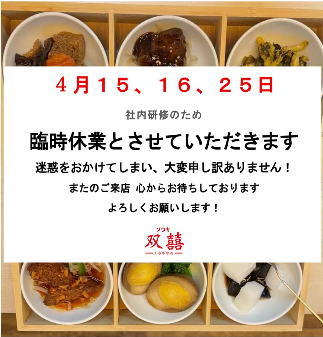 社員研修をいたしまして、大変申し訳ありませんが、勝手ながら、今月の15(水)、16(木)、25日(土)は臨時休業をさせていただきます。